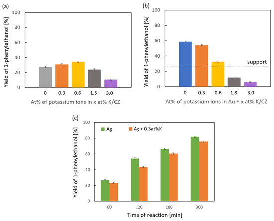 The impact of the potassium ion loading on the activity of Ce0.85Zr0.15O2 is shown in Figure 5a. It can be seen that the initial, low concentrations of potassium ions, i.e., 0.3 and 0.6 at% exerted a small, but beneficial effect on the support, whereas the doping of Au/Ce0.85Zr0.15O2 (Figure 5b) with those loadings of potassium suppressed the activity of the undoped gold catalyst. This is similar in the case of CO oxidation [45,47]. The further addition of potassium ions had a detrimental effect on the activity of the support and the gold catalyst. It is noteworthy that with potassium ion loadings above 0.6 at%, the yield of 1-phenylethanol observed in the presence of the gold catalyst fell below that of the undoped support. Side and subsequent reactions were responsible for this and the liquid changed from clear and colorless to yellow. The intensity of the color of the solution increased with reaction time, which indicates larger yields of byproducts. In the case of the most active silver catalyst, the presence of 0.3 at% K+ caused a decrease in the activity (Figure 5c). Hence, it is possible that in the case of the support, which is much less active, but shows a slight improvement upon doping with potassium ions, there is a different mechanism of the reaction or that the monometallic catalysts have more than one mechanism and the more efficient one is negatively affected by the presence of potassium ions.