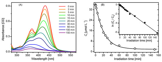 (A) Absorption spectra of AO (35.06 μmol L−1) in an aqueous colloidal solution, in the presence of 5 mg TiO2 NPs, after different irradiation times, as indicated; and (B) a plot of against AO as a function of irradiation time, simulated using the Langmuir–Hinshelwood kinetic model. Inset: the linear plot of against irradiation time.
