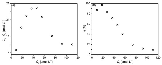 In this study, the TiO2 NPs used as photocatalyst were pure anatase crystals, which was confirmed based on FTIR spectra (not shown) and XRD patterns (see Figure S9). The particle size of TiO2 NPs is approximately 100 nm with a BET surface area and pore volume of 12.791 m2 g−1 and 0.05733 cm3 g−1, respectively [27]. With the bandgap energy being 3.20 eV, the 365 nm light irradiation easily excites the TiO2 NPs, generating electron–hole pairs [56]. This is an advantage in the degradation of AO, because AO absorbs mainly in the visible region. In this sense, the UV irradiation mostly excites the catalyst and, in any case, the photolysis of the dye is inefficient.