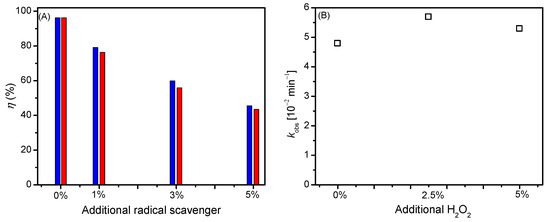 The photocatalytic degradation of AO was also followed in the presence of a small amount (1–5%) of benzoquinone (BQ) and tert-butanol (t-BuOH) which scavenge ● and OH● radicals, respectively. It was found that the value of AO decreases abruptly with the addition of BQ and t-BuOH, as shown in Figure 4A. This result confirms that the degradation mechanism by UV/TiO2 NPs depends on the oxidation reaction of the dye with both ● and OH● radicals, as has been described in several studies [50,51]. The formation of ●, by reduction of solvated oxygen in the aqueous solution, is an important step to prevent the recombination of the photogenerated electrons and holes [52]. High concentrations of oxygen in the solution should reduce the recombination process and hence assist the formation of both ● and OH● radicals. To explore this possibility, the effect of adding a small amount of H2O2 on the of the photocatalytic degradation of AO was evaluated, as presented in Figure 4B. The dissociation of H2O2 enhances the concentration of oxidants. This accelerates the generation of ● and OH● radicals [53], leading to a higher photodegradation rate, although the efficiency of AO after prolonged irradiation time was almost unchanged (96.2–97.3%). Thus, the results further suggest that the generation of ● and OH● radicals is the rate-determining step of the photocatalytic degradation of the dye.