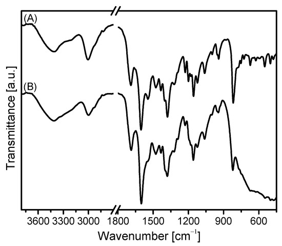 Steady-state FTIR spectroscopy was used to search for large molecular fragmentation of the products from the photocatalytic degradation of AO. For this analysis, the AO solution after irradiation (see Figure S3) was collected and dried. The vibrational spectrum was then measured in the spectral range of 4000 to 450 cm−1, as shown in Figure 5. For comparison, the spectrum of AO before irradiation is also presented. The main vibrational bands of AO before irradiation were observed at 3407, 3004, 1691, 1602, 1374, 1156, 941, and 821 cm−1, which are assigned to NH stretching of dimethyl amine, C=N stretching, CH of aromatic rings, C=C stretching of aromatic rings, CH bending of aromatic rings, C–N stretching, C–C stretching, and CH out-of-plane bending vibrations of the dye, respectively. Similar spectral features of AO were reported by Mallakpour et al. [54].
