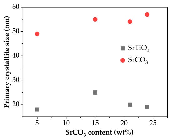 The primary crystallite size (PCS) of components is summarized in Table 1. The PCS of SrTiO3 was in the range of 18–28 nm, whereas much higher values (49–57 nm) were obtained in the case of SrCO3.