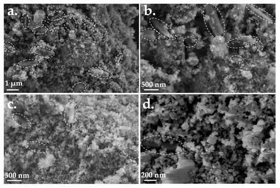 The SEM micrographs of the selected hydrothermally synthesized SrTiO3-based samples, namely STO_15_SCO and STO_24_SCO, are presented in Figure 3. No considerable differences are revealed in the case of the selected STO-based samples regardless of the Ti4+ precursor type (P25 or anatase). Two characteristic morphologies were identified, namely nanocubes and microrods (marked with white dotted line). The length of these microrods was situated between 1–1.5 μm, and their width was identified in the 165–400 nm range. The characteristic dimension of the nanocubes varied in the range of 40–80 nm, which is in agreement with the results reported in the literature [4,38].
