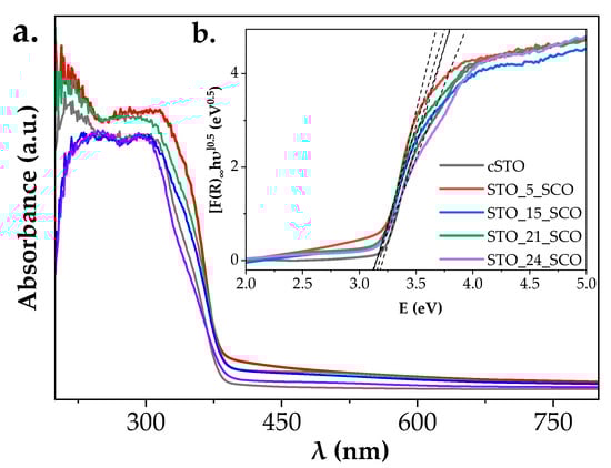 The absorption spectra of the studied samples were recorded in the UV-Vis range (Figure 4a). As expected, the STO-based samples absorb photons mainly from the UV-range (200–400 nm). The band gap energy values (ΔEg) were calculated from the Tauc-plot (Figure 4b) considering the appropriate exponent (0.50) for indirect band gap semiconductors [4]. The well-known procedure (i.e., extrapolation of the linear region of the Tauc-plot) was applied, which led to ΔEg values situated in the range of 3.1–3.2 eV (Table 2). The ΔEg values determined for commercial and hydrothermally synthesized SrTiO3 are in agreement with the values reported in literature [41]. No considerable shift in the absorption edge can be observed in the case of samples with different SrCO3 content in the recorded range, since SrCO3 absorbs electromagnetic radiation characterized with relatively high energy (4.9 eV [22]), which cannot be resolved within the recorded range. Furthermore, the absorption threshold (λthres, Ethres) of the studied catalysts was determined based on the first derivative reflectance spectra and summarized in Table 2. As was expected, slightly higher values were assigned for the absorption threshold energies in comparison with the ΔEg.