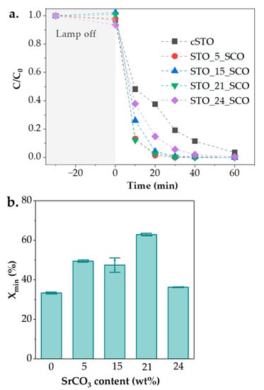 The photocatalytic activity of the SrTiO3-SrCO3 composites was assessed by the degradation of DCFNa (C0 = 25 mg∙L−1) in aqueous solution under white light irradiation. The degradation curves are presented in Figure 5a. 30 min were allocated for the establishment of adsorption-desorption equilibrium (stirring, dark) before turning on the light. Neglectable DCFNa adsorption can be observed in case of all the SrTiO3-based catalysts after the dark phase, which can be explained by the relatively low differences in SSA (15–45 m2∙g−1). The degradation of DCFNa was almost complete after 1 h irradiation in all studied samples (inclusively the commercial SrTiO3 and SrTiO3-SrCO3 composites). This indicates that the presence of SrCO3 mainly affects the mineralization, i.e., total oxidation of DCFNa. The degradation curve can be described by pseudo first-order kinetics (see Figure S1, Supplementary Material) as previously reported [42]. The fastest DCFNa degradation was achieved for STO_5_SCO and STO_21_SCO. Here, the rate constant was four times higher than that of pure SrTiO3 (cSTO). Beside DCFNa degradation, the effect of SrCO3 content on mineralization was also investigated after 4 h. The mineralization of DCFNa during photolysis was below 3%, which was in agreement with previously reported results [43]. According to Figure 5b, higher mineralization efficiencies (Xmin) were observed in case of samples containing tSrCO3 phase in comparison with cSTO. Although quite similar mineralization efficiencies were assessed in the cases of STO_5_SCO and STO_15_SCO (~50%), the highest efficiency was reported in the case of STO_21_SCO (62%). Similar optimal SrCO3 content (i.e., 19 wt%) of the SrTiO3-SrCO3 catalyst was determined by Marquez-Herrera during the photodegradation of methylene blue [22].