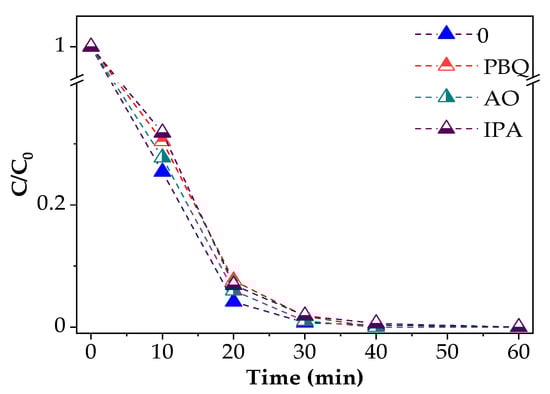 The same experimental conditions were applied during the scavenging experiments as during the degradation experiments, using ammonium oxalate (AO), p-benzoquinone (PBQ), and isopropanol (IPA). The initial concentration of scavengers in the reaction mixture was 393 μM (AO, PBQ) and 1.57 mM (IPA).