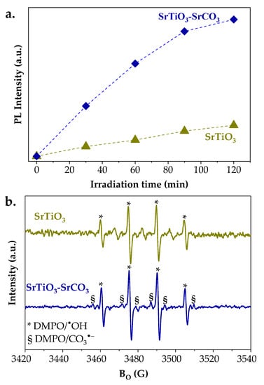 To investigate whether the presence of SrCO3 can influence the amount of reactive •OH formed during irradiation, the terephthalic acid hydroxylation reaction was carried out using STO_15_SCO and cSTO (Figure 7a). Considering the proportionality between concentration and photoluminescence (PL) intensity, the amount of •OH was 3.5 times higher in the reaction mixture using STO_15_SCO in comparison with cSTO. Since improved charge separation takes place in SrTiO3-SrCO3 composites [19] (Figure 8), more holes are left over SrTiO3, which may lead to the formation of higher amounts of •OH. However, this is just evidence for better charge separation, and not for the fact that •OH are the main active species responsible for the photodegradation of DCFNa.