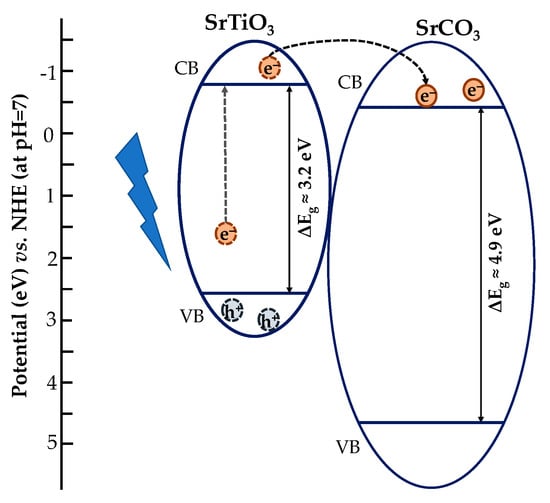 Titanium-based materials, such as titania, alkaline earth metal titanates, etc., are considered as suitable candidates for photocatalytic applications [1,2]. Among these, SrTiO3 seems to be a promising candidate given its band-structure [3], considerable catalytic activity, and chemical and thermal stability, and the long lifetime of the photogenerated charge carriers [4]. One unique property of SrTiO3 is directly related to its slightly different conduction band (CB) edge situated at a more negative potential in comparison with anatase (i.e., ECB(anatase): −0.1 V, ECB(SrTiO3): −0.3 V vs. NHE at pH = 0 [5]), which has a direct influence on its water splitting ability. Although the CB position of TiO2 (both anatase and rutile) does not allow efficient H2 production (from H2O) unless in the presence of co-catalysts, this limitation is overcome in the case of SrTiO3 [6,7].