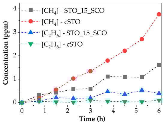 Concentrations of CH4 and C2H6 formed over time in the presence of CO2 for the hydrothermally synthesized SrTiO3 (STO_15_SCO) and commercial SrTiO3 (cSTO).