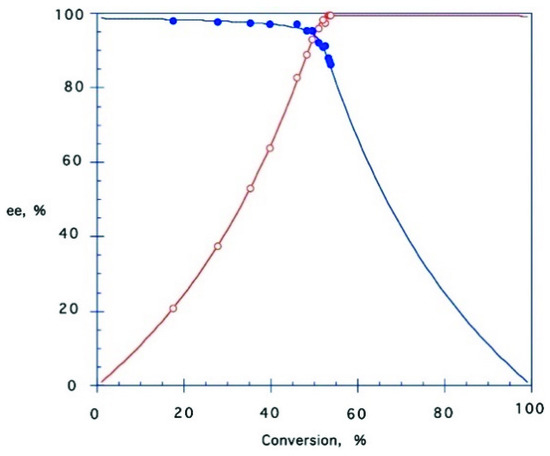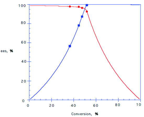 Graphical representation of the kinetic resolution of chlorohydrin 3 with CALB in dry acetonitrile with vinyl butanoate as the acyl donor. Enantiomeric excess of the remaining substrate (eeS, red circles) and enantiomeric excess of the product ester (eeP, blue circles) is shown in percent plotted against conversion in percent. The red and the blue curves are generated from the experimental values of eeS and eeP, respectively. The E-value was calculated to be 157. E-values were calculated from E&K Calculator 2.1b0 PPC [16].