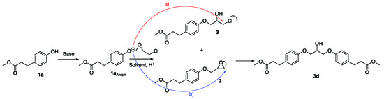 A dimeric by-product was observed in the reaction between deprotonated phenol 1a, epichlorohydrin, and potassium carbonate to form epoxide 2 (Scheme 1 and Scheme 2). LC-MS analysis gave a peak with m/z = 439.2, molecular formula C23H28O7Na, which corresponds to 3,3′-(((2-hydroxypropane-1,3-diyl)bis(oxy))bis(4,1-phenylene))dipropanoate (3d) with a molecular mass of 416.45 g/mol. By purification of the reaction mixture using flash chromatography in order to obtain pure epoxide 2, dimer 3d was isolated in 6% yield with a purity of 99%. Characterisation of 3d was performed by 1H-, 13C-, H,H COSY-, HSQC- and HMBC NMR spectroscopy, with deuterated chloroform as the solvent. 1H- and 13C- NMR spectra for dimer 3d are given in the Supplementary Materials, in addition to the achiral HPLC chromatogram. We have observed the same type of dimers in the synthesis of similar β-blocker precursors [3], and here we propose plausible mechanisms for the 3d dimer formation, see Scheme 2. We suggest that using a larger amount of epichlorohydrin could limit the amount of dimer formed, as the alkoxide 1aAnion would have better access to epichlorohydrin as opposed to the products 2 and 3, which could improve the yield of the first reaction step. However, we have managed to reduce the epichlorohydrin from 5 equivalents in similar syntheses reported by Bevinakatti and Banerji in 1992 [15] to 2 equivalents, also used in our previous report on the syntheses of several β-blockers [3].