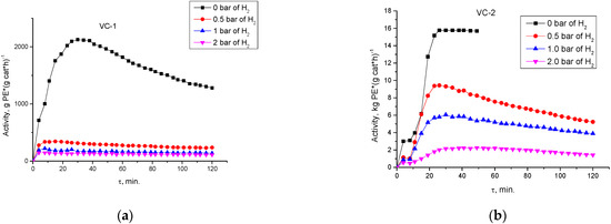 All the kinetic curves of ethylene polymerization over the “high-loading” catalyst (VC2) (Figure 1b), both without hydrogen and at its different contents (4.5–16 vol. %), have a similar acceleration period of the reaction (ca. 30 min) up to the maximum polymerization rate, which decreases with increasing hydrogen concentration.