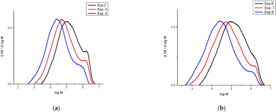 MWD curves of the polymers obtained on the “low-loading” (VC1, exps. 2–4) (a) and “high-loading” (VC2, exps. 6–8) (b) VMCs (polymerization conditions are listed in Table 1).