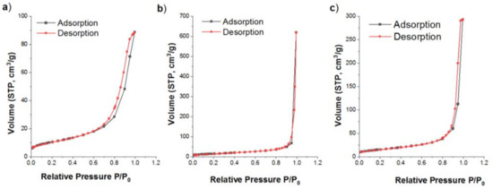N2 adsorption–desorption isotherms of (a) Fe3O4 (b) TiO2 and (c) TiO2–Fe3O4.
