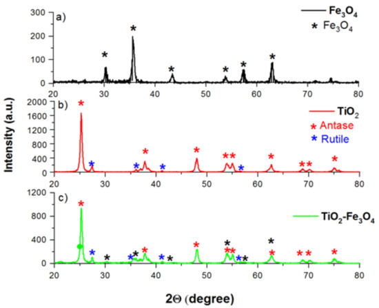 The XRD pattern of synthesized Fe3O4 nanoparticles (Figure 3a) showed good agreement with the phase structure of magnetite with sharp peaks at 2θ = 30.4°, 35.6°, 37.2°, 43.4°, 47.3°, 53.2°, 57.4°, and 62.5, corresponding to crystal planes of (220), (311), (222), (400), (331), (422), (511), and (440), respectively [4]. These peaks were also found in the XRD pattern of Fe3O4–TiO2, thus suggesting that Fe3O4 attached on the surface of TiO2 maintain their crystal cubic inverse spinel structure and magnetic properties [44]. The peaks observed on the XRD pattern of uncoated TiO2 (Figure 3b) at 2θ = 25.4°, 37.8°, 48.1°, 54.0°, 55.1°,62.7°, 68.8°, 70.2°, and 75.1° match very well with (101), (004), (200), (105), (211), (204), (116), (220), and (215) crystal planes of anatase [45], while the peaks observed at 2θ = 27.4°, 36.1°, 41.2°, and 56.5° are assigned to the (110), (101), (111), and (220) planes of rutile, indicates that P25–TiO2 powder consisted of both phases (83 wt.% of anatase and 17 wt.% of rutile). Peaks characteristics for anatase and rutile were also observed in XRD patterns of TiO2–Fe3O4 (Figure 3c) but their intensity was lower compared with those obtained in the XRD pattern of TiO2 (Figure 3b), which can be ascribed to the shielding effect of magnetic nanoparticles formed on the surface of the TiO2. Other authors also reported that titania coated with magnetic nanoparticles led to decreased peak intensity [46]. However, we suggest that the photocatalytic activity of TiO2 in TiO2–Fe3O4 maintained the same after coating their surface with magnetite nanoparticles since these composites keep both phases of TiO2. Hurum et al. [9] reported that TiO2 composed of mixed-phase of anatase and rutile has better photocatalytic activities compared with the pure phase of TiO2 since the rutile extends the useful range of photoactivity into the visible region and structural arrangement of the similarly sized TiO2 crystallites creates hot spots at the rutile-anatase interface.