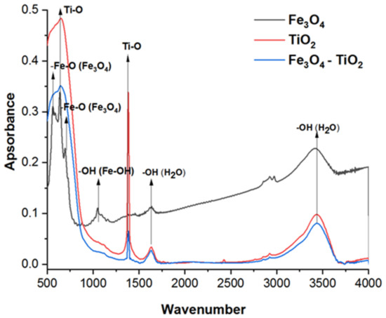 FTIR spectra of Fe3O4, TiO2, and TiO2–Fe3O4 are present in Figure 4. All peaks found in these spectra are summarised in Table 2. As can be seen from Figure 4, all spectra exhibited peaks at 3424 and 1635 cm−1 corresponding to the stretching and bending vibration of the hydroxyl group of surface adsorbed water [4,44,45]. Additional peaks at 694, 639, and 560 cm−1 observed in FTIR spectra of Fe3O4 were related to the stretching vibration of –Fe–O– from magnetite [46]. The absorption peaks at 650 cm−1 and 1383 cm−1 were related to stretching vibration of Ti–O and Ti–O–Ti and were observed at FTIR spectra of both, coated and uncoated TiO2 [52].