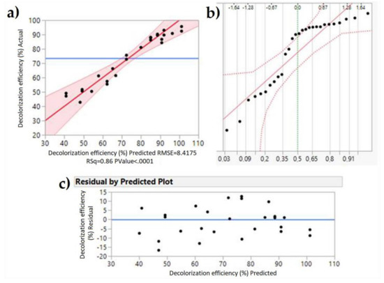 Diagnostic diagrams: (a) Diagram of the dependence of the actual in relation to the predicted values of the dye decolourisation efficiency; (b) Normal distribution diagram; (c) Diagram of the deviation of the standardized residuals from the zero line.