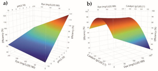 Diagrams of response surfaces for two-factor interactions (dye concentration and pH, dye concentration and catalyst concentration) are shown in Figure 6.
