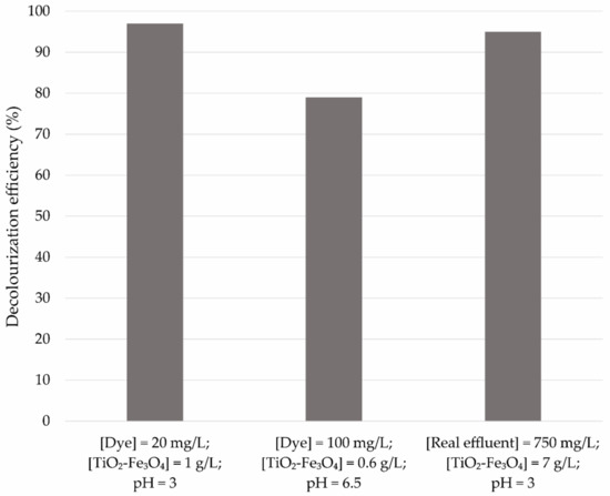 - Favouring milder process conditions and according to statistical modelling, decolourisation of magenta effluent of 85.07% is achieved following optimal conditions of dye concentration of 100 mg/L, TiO2–Fe3O4 concentration of 0.6 g/L, and pH of 6.5.