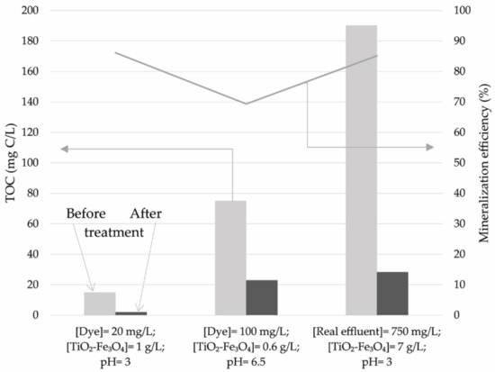 In the same run, the total organic carbon (TOC) content was determined prior and after the process to evaluate mineralisation efficiency. Both TOC concentrations and mineralisation efficiencies are given in Figure 9.