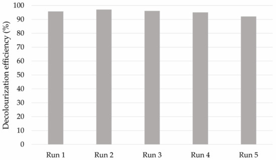 It should be noted that, after each run, the applied catalyst was separated via an external magnetic field and washed with distilled water several times and dried at 105 °C for 2 h, and then annealed at 200 °C for 2 h. This is important to remove impurities, as the formation of by-products and their accumulation on the active surface sites of the catalyst will cause partial blockage of the pore system and cover its surface. Certainly, further repeating of this step will eventually cause a decrease in efficiency due to material scattering and photo corrosion.