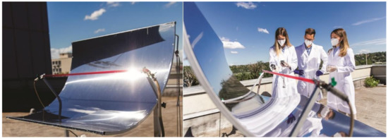 Application of parabolic through concentrator (PTC) reactor in wastewater treatment is new, while the use of hybrid magnetic nanophotocatalyst (TiO2–Fe3O4) in this system has not been evaluated so far. Namely, PTC reactors consist of a highly reflective surface area, known as a parabola, an absorption tube located in the focus of the parabola, and a Sun tracking system [31,32]. They are mostly applied to generate hot water or to produce renewable electricity. On the other hand, PTCs could be used in solar photochemical processes due to the collection of only high-energy photons of short wavelengths. Here, reaction fluid (wastewater effluent) must be directly exposed to solar radiation. Generally, the most suitable time to use this type of solar reactor is during summertime, whose efficiency could be affected by weather conditions (clouds) and position (North-South; East-West) [32].