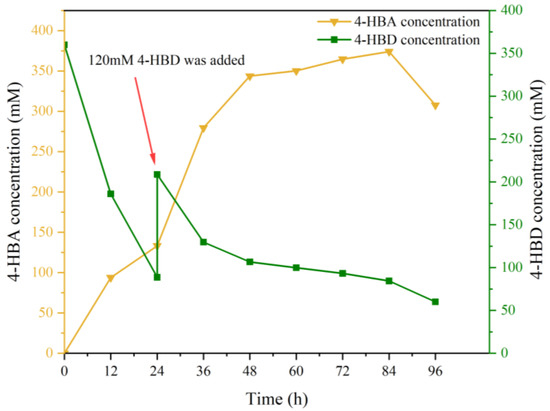 Reaction time curves of supplemental 4-HBD. The red arrow in the figure indicates that an additional 120 mM 4-HBD was added at 24 h.