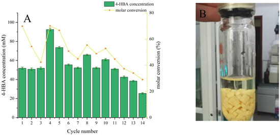 Immobilized E. coli BL21 (DE3)/pRSF-Deoc in K-carrageenan was used in order to realize the reuse of cells. Each batch of reaction was carried out at 120 mM 4-HBD and 60 °C for 24 h, and the results are shown in Figure 5. The obtained immobilized cells were used for multiple batches of catalysis. Each batch was run at 120 mM 4-HBD and 60 °C for 36 h. In the first 10 batches of reaction, the product concentration fluctuated between 50 and 90 mM. Among them, the conversion rate gradually decreased from batch 1 to batch 3, indicating that the immobilized cells were in the mass transfer stage, and that the conversion rate stabilized after the third batch and decreased after 10 batches. The residual cell activity remained at 90% after the 10 cycles (360 h), and after 13 batches of biosynthesis, the molar conversion rate dropped to 34%, indicating a deactivation of immobilized cells.