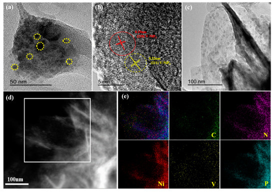 (a,c) TEM of V-NiP2/g-C3N4, (b) HRTEM of V-NiP2/g-C3N4; (d,e) elemental mapping of C, N, Ni, V, and P, respectively.