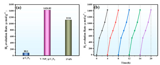 In order to determine the photocatalytic hydrogen evolution activity of all samples, photocatalytic tests were carried out with triethanolamine acid (TEOA) as a sacrificial agent under a 300 W lamp irradiation for 4 h. As presented in Figure 3a, pure g-C3N4 shows trace hydrogen evolution amounts due to the fast photogenerated carrier recombination and low-light absorption capacity [48]. However, V-NiP2/g-C3N4 composites present an obvious improved HER performance with a hydrogen production rate of 1426.82 µmol g−1, even higher than the 1%wt Pt/g-C3N4 (1116 µmol g−1). Furthermore, the as-prepared V-NiP2/g-C3N4 material exhibits much higher than most of the other g-C3N4-based photocatalysts (Table S1) [23,26,27,30,36,37,38,39]. The excellent catalytic HER activity can be mainly ascribed to the following three aspects: (i) the facilitated absorption of the visible-light region of g-C3N4 due to the incorporation of black V-NiP2 nanoparticles; (ii) the enhanced electron transfer rate resulting from the good electrical conductivity of V-NiP2; and (iii) the inhibited recombination rate of photogenerated electron-hole pairs on the g-C3N4 photocatalyst because the V-NiP2, as the electron trapping agent, can capture the photo-generated electron quickly. To evaluate the long-term stability of V-NiP2/g-C3N4, five cycles of H2 production experiments are shown in Figure 3b, no distinct decrease in the hydrogen evolution amount is observed, illustrating that V-NiP2/g-C3N4 maintains good stability. In order to verify the structure’s stability, the microstructure of V-NiP2/g-C3N4 after the test is characterized by HRTEM and elemental mapping, as shown in Figure S5. It can be seen that the NiP2 phase still exists in the used photocatalysts, and C, N, P, V and Ni elements are distributed in this material, indicating its structural stability during 20 h photocatalytic HER.