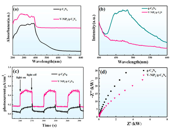 (a) UV–vis diffuse reflection spectra of pure g-C3N4 and V-NiP2/g-C3N4; (b) The photoluminescence (PL) spectra of g-C3N4 and V-NiP2/g-C3N4; (c) Transient photocurrent responses of g-C3N4 V-NiP2/g-C3N4; (d) EIS Nyquist plots of g-C3N4 and V-NiP2/g-C3N4 in 0.5M Na2SO4 solution visible light irradiation.
