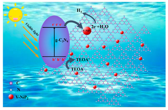 Through discussion and analysis of the above experiment results, a plausible photocatalytic mechanism schematic in Figure 5 is carried out to help understand the specific photocatalytic hydrogen evolution reaction process of the V-NiP2/g-C3N4 photocatalyst. Under visible-light irradiation, the electrons of g-C3N4 on the valence band (VB) absorb the energy of photons, and then become excited and are transferred to the conduction band (CB), owing to the metallic character of V-NiP2. The photogenerated electrons are trapped by the V-NiP2 and easily and rapidly migrate to the V-NiP2 passing through the intimate interface, so the combination of photogenerated electron-hole pairs is retarded. Subsequently, the photo-generated electrons on the surface of V-NiP2 combine with H+ ions to form H2 molecules and are released from the water. Simultaneously, the photo-generated holes on the valence band of g-C3N4 will be timely depleted by the TEOA sacrificial reagent. Therefore, the photocatalytic hydrogen performance is greatly improved with the help of the V-NiP2 cocatalyst.