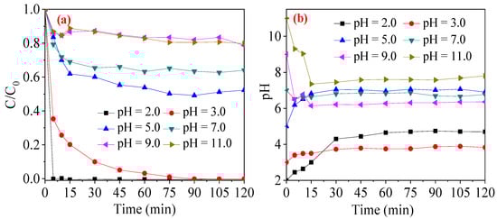 Figure 3a shows that Cr(VI) removal by nZVI strongly depended on the solution pH. The process efficiency was significantly hindered under neutral and alkaline conditions, while a promising removal of Cr(VI) was observed at acidic conditions. When the initial solution pH decreased from 11.0 to 2.0, the adsorption capacity of Cr(VI) by nZVI in 120 min remarkably increased from 7.11 to 50 mg/g (Figure S2). Additionally, Cr(VI) of 25 mg/L could be completely removed by nZVI at pH 2.0 in 5 min, while the removal efficiency was only 21.4% at pH 11.0 in 120 min. The effect of pH level on the removal of Cr(VI) by nZVI was probably attributed to the following reasons. At acidic conditions, Fe0 reduces Cr(VI) to Cr(III) by losing electrons to form Fe2+/Fe3+; meanwhile the newly formed Fe2+ can further facilitate the reduction of Cr(VI) to Cr(III) [23]. However, higher amounts of OH− at elevated solution pH can be easily combined with Fe2+/Fe3+ to form Fe(OH)2/Fe(OH)3 precipitates, attaching on the surface of nZVI. This process not only consumes the effective reactant Fe2+, but also blocks the reactive sites on the nZVI surface, resulting, therefore, in a substantial decrease in process efficiency. On the contrary, a large amount of H+ in the solution at acidic conditions can accelerate the dissolution of hydroxide precipitates, which increased the effective site on the surface of nZVI and improved the specific surface area of nZVI and the adsorption/reduction capacity of Cr(VI).
