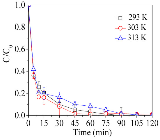 The removal kinetics of Cr(VI) by nZVI at different temperatures (293, 303, and 313 K) were shown in Figure 4. It can be seen that increasing the temperature from 293 to 303 K led to an improved removal of Cr(VI), possibly attributable to the increased collision rate between Fe0 and Cr(VI) with the increase in temperature and, consequently, the increased removal kinetics of C(VI) by nZVI [24]. However, when the reaction temperature further increased to 313 K, the removal of Cr(VI) was retarded. This might be due to the enhanced re-release of Cr(VI) adsorbed on the particle surface to the solution at high temperature, resulting in the increase in Cr(VI) concentration in the solution.