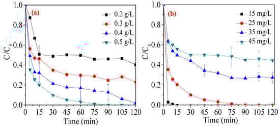 The removal rate of Cr(VI) by nZVI at different initial Cr(VI) concentrations and nZVI dosage was illustrated in Figure 5 and Figure S2. When the initial concentration of Cr(VI) was fixed at 25 mg/L, the increase in nZVI dosage from 0.2 to 0.5 g/L remarkably improved the removal rate of Cr(VI) and adsorption capacity of nZVI from 50% to 100% and from 29.9 to 50.0 mg/g, respectively. It can be seen from Figure 5a that, at nZVI dosage of 0.2 g/L, the reaction basically stopped after 15 min. Once nZVI of low dosage was added into the solution, a relatively large number of Cr(VI) simultaneously competed for limited adsorption sites, thereby inhibiting any further reaction. In contrast, higher nZVI dosage could provide a larger number of active sites for reaction with the target contaminant, accordingly allowing a better removal efficiency.