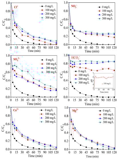 Some ions commonly present in water, including Cl−, HCO3−, NO3−, SO42−, Ca2+, and Mg2+, were selected to explore their influence on the removal of Cr(VI) by nZVI. Experimental results showed that all the studied ions inhibited the process efficiency; nevertheless, the degree of inhibition distinctively varied depending on the properties of the ions. The inhibitory effect of anions on the removal rate of Cr(VI) increased in the order of Cl− < NO3− < SO42− < HCO3−, while the inhibition of Ca2+ and Mg2+ on Cr(VI) removal was negligible.