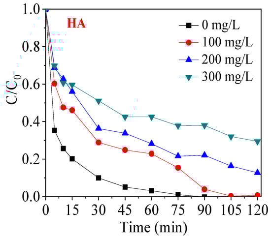 The effect of humic acid (HA) to simulate dissolved organic matter ubiquitously existing in aquatic systems on the process efficiency was also examined. It could be seen from Figure 7 that Cr(VI) removal kinetics remarkably decreased with the increase in HA concentration. As a highly heterogeneous mixture of macro organic molecules, HA contains a large number of functional groups that are easily adsorbed on the particle surface, blocking the effective sites of nZVI and affecting the electron transfer route between Cr(VI) and nZVI. It was reported that the –OH and –COOH groups abundantly existing in HA could occupy the effective sites on the surface of nZVI, which acted as a steric obstacle for the mass and electron transfer of target contaminant and, therefore, suppressed the process efficiency [35,36]. In addition to the strong affinity of HA to the nZVI surface, HA also exerts an influence on the nZVI system through complexation and aggregation, forming iron–humic acid complexes and colloids with Fe0 and Fe3+ as coordination centers, which could alter the reactivity of nZVI and the adsorption/reduction of contaminants [37,38].