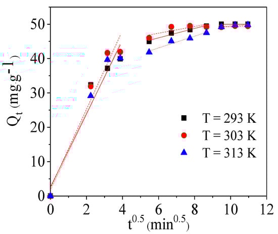 Kinetic data for the adsorption of Cr(VI) onto nZVI was modelled according to the intraparticle diffusion equation to understand the rate-determining step of this process [39]. It was found from Figure 8 and Table S4 that the adsorption process can be divided into three stages, which consisted of an initial surface diffusion stage, then internal diffusion process of particles, followed by the equilibrium dynamic process of adsorption and desorption [39]. Figure 8 shows that the three stages of adsorption are rendered as a continuous and segmented process. The surface adsorption phase was completed within 15 min of the beginning of the reaction. Due to the high specific surface area of nZVI and the large number of available reactive sites at the initial stage, Cr(VI) in the solution can be quickly adsorbed onto the surface of nZVI, leading to a rapid reduction in Cr(VI) concentration in the solution in 15 min. The internal diffusion process of nZVI was completed in the following 75 min, where Cr(VI) adsorbed on the nZVI surface reacted with Fe0 to form Cr(III), and precipitates attached to the particle surface and then reached the adsorption equilibrium. In the first two stages, the rate-limiting step were the surface pores of the particles. For the third stage, it might be due to the saturation of adsorption, in agreement with the pseudo-second-order dynamic model analysis. As also observed by Wang et al. [40], the second stage did not pass through the origin, suggesting that both the intraparticle diffusion and chemical reactions are important rate-limiting factors in controlling the adsorption process.