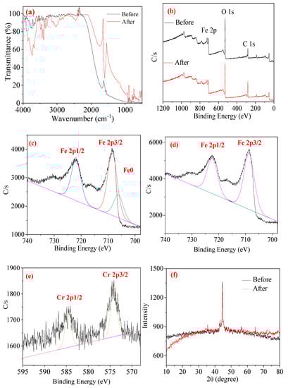 (a) The FTIR results of nZVI pre- and post- reaction with Cr(VI); (b) wide-scan XPS survey of nZVI before and after Cr(VI) adsorption; a magnified region in the XPS survey of nZVI before (c) and after (d) Cr(VI) adsorption; (e) a high-resolution Cr XPS survey of nZVI before and after Cr(VI) adsorption; (f) XRD analysis of nZVI before and after the reaction. ([Cr(VI)] = 25 mg/L, [nZVI] = 0.5 g/L, pH = 3, T = 293 K, Time = 120 min).