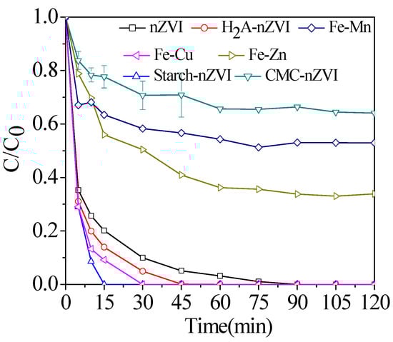 The preparation procedures of modified nZVI were as follows: dissolve 3.475 g FeSO4∙7H2O (i.e., 12.5 mM) in 250 mL deionized water, and then add different dispersants (10 g/L H2A, 0.2% starch, and 0.5% CMC) to obtain H2A–nZVI, starch–nZVI and CMC–nZVI, while Fe–Cu, Fe–Zn, and Fe–Mn bimetals were synthesized by mixing 3.475g of 95% Fe2+ and 5% Cu2+, Mn2+, and Zn2+, respectively, with 250 mL deionized water at pH 3. The method of synthesis was the same as the previous procedures. All synthetic experiments were carried out at 293 K.