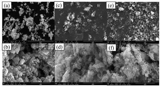 The SEM results of pre- and post-reaction Cr(VI) with supported nZVI. Here, (a,b) H2A–nZVI; (c,d) starch–nZVI; (e,f) Fe–Cu.