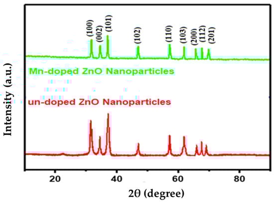 The X-ray diffractograms of ZnO and Mn-ZnO NPs are shown in Figure 1. The XRD pattern of ZnO showed peaks at 2θ° = 32.29°, 34.94°, 36.77°, 48.04°, 57.08°, 63.33°, 66.89°, 68.41°, 69.52°, and 77.45°, which correspond to the (100), (002), (101), (102), (110), (103), (200), (112), (201), and (202) crystalline planes of ZnO (Figure 1). The diffraction patterns of the synthesized ZnO NPs match well with the standard Bragg positions for the hexagonal phase of wurtzite ZnO (JCPDS 01−079-2205) [,]. The absence of any impurity peak in the Mn-ZnO XRD pattern suggests that the divalent cations (Mn2+) successfully replaced Zn2+ ions in the zinc oxide matrix. Moreover, the X-ray diffraction patterns of Mn-ZnO showed a minor shift towards the higher angle and the intensity of peaks was lowered, demonstrating the effective doping of Mn into ZnO []. The intensity of the peaks was decreased for Mn-ZnO nanoparticles and this might be due to the high ionic size of Mn2+ (0.80A°) compared to that of Zn2+ (0.74 A°). The results obtained were the same as those in the previously reported work [,,,,].