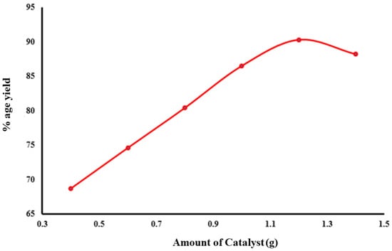 The transesterification reaction is significantly influenced by the catalyst concentration. Therefore, the quantity of catalyst used must be checked during biodiesel generation. In the current study, the amount of catalyst used to perform the transesterification reaction varied from 0.4 g to 1.4 g in six experiments, keeping the amount of oil, the temperature, and all other conditions constant. The biodiesel yields obtained with varying amounts of the nanocatalyst are shown in Figure 3. Figure 3 shows that the maximum yield of biodiesel (90.3%) was obtained in experiment No. 5, using 1.2 g of the (Mn-doped ZnO) catalyst, and a further increase in the amount of catalyst resulted in a decrease in the yield of biodiesel because adding too much of the catalyst increased the viscosity of the solution and the yield of biodiesel decreased []. The results are summarized in Table 2.