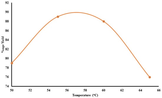 The biodiesel production was also measured at temperatures ranging from 50 °C to 65 ° C, keeping all other parameters constant, as shown in Table 2. We observed that the yield of biodiesel increased with an increase in temperature up to 55 °C, and a further rise in temperature resulted in a decrease in the yield of biodiesel, as shown in Figure 5. In fact, the yield increased along with the increase in temperature because of an increase in the solubility of the solvent but a further increase in temperature resulted in the evaporation of methanol, which decreased the biodiesel yield, as shown in Figure 5 [].