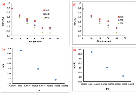 Graph expressing the relationship between ln(At/Ao) and the time of the transesterification reaction at 50 °C, 55 °C, and 60 °C, showing the progress of the reaction. (a) Linear portion of the graph expressing the relationship between ln(At/Ao) and the time of the transesterification reaction at 50 °C, 55 °C, and 60 °C, used to calculate kapp for the transesterification reaction. (b) Arrhenius plot comparing ln(k) and 1/T for the calculation of the energy of activation of the transesterification reaction. (c) Eyring plot comparing ln(k/T) and 1/T for the calculation of the enthalpy and entropy of the transesterification reaction (d).