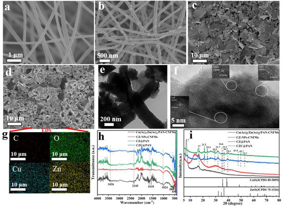 SEM image of Cu(Ac)2/Zn(Ac)2/PAN-CNFM (a); SEM image of CZ-NPs-CNFMs (b); SEM image of CZ@PAN (c); SEM image (d), HRTEM image (e), TEM image (f), and EDS results (g) of CZC@PAN; FTIR patterns (h) and XRD spectra (i) of samples.