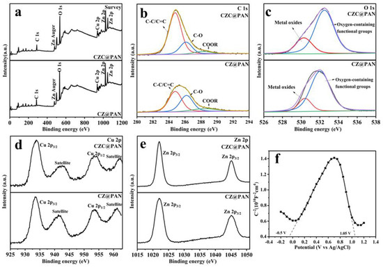 XPS spectra of samples: survey (a), C 1s (b), O 1s (c), Cu 2p (d), and Zn 2p (e); Mott-Schottky curve of CZC@PAN (f).