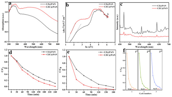 Compared with CZ@PAN, CZC@PAN demonstrated stronger response and a considerable red-shifted absorption edge in the visible light region (Figure 3a). According to Tauc plot (Figure 3b), the band gap energy of CZ@PAN and CZC@PAN was close, verifying that there was no new energy band structure in CZC@PAN compared with CZ@PAN, including a new bandgap formed. When the excitation wavelength was 370 nm, the fluorescence intensity of CZC@PAN was lower than that of CZ@PAN, indicating that the loading of CQDs was more helpful to hinder the recombination of photogenerated electron–hole pairs (Figure 3c). The above results showed that CZC@PAN had better photocatalytic performance than CZ@PAN.