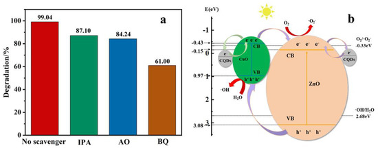 Free radical capture experiments illustrated the addition of BQ reduced the photodegradation rate of MB to 61%, while the addition of IPA and AO reduced the photodegradation rate to 87.10% and 84.24%, respectively (Figure 4a). Therefore, ·O2− was the main active group, while ·OH and photogenerated h+ contributed relatively less to the MB degradation. Based on the above characterization and analysis, a photocatalytic degradation mechanism of CZC@PAN was presented, as shown in Figure 4b. The conduction band (CB) potentials for CuO and ZnO were −0.43 eV and −0.15 eV vs. normal hydrogen electrode (NHE), respectively, while the band gaps of CuO and ZnO were 1.4 eV and 3.23 eV, respectively [30]. Therefore, the valence band (VB) potentials for CuO and ZnO were 0.97 eV and 3.08 eV, respectively. When CuO/ZnO/CQDs heterostructures were exposed to sunlight, the photogenerated electrons (e−) on the CB of CuO migrated to the CB of ZnO, while the h+ on the VB of ZnO transferred to the VB of CuO, resulting in many photoexcited electron–hole pairs on CuO/ZnO heterostructures, effectively separating the photogenerated carriers through the p-n heterostructures, and extending the light response range of ZnO from the UV region to the visible region [5,30,43]. Meanwhile, the up-converted PL behavior of CQDs can further broad the light utilization range of CuO/ZnO, excite CuO/ZnO to form more photogenerated electron–hole pairs [35,36]. Besides, CQDs could not only boost e− transfer to the surface of CuO/ZnO heterostructures, but also transfer excess e− from CuO/ZnO heterostructures to CQDs, thus improving the separation rate of electron–hole pairs [14,15,16,17,18,22,44,45]. Then, through redox reactions, O2 adsorbed on the catalyst surface captured e− to produce ·O2− (−0.33 eV vs. NHE) and h+ combined with H2O to generate ·OH (2.68 eV vs. NHE) [46], which oxidized organic pollutants into CO2 and H2O, resulting in higher photocatalytic activity.