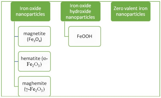 Iron nanoparticles are non-toxic particles with excellent dimensional stability, high catalytic activity, high magnetism, high thermal and electrical conductivity, high surface area and high microwave adsorption ability [16,27]. However, iron nanoparticles are prone to oxidation, which is described as their greatest weakness [28]. The classification of iron nanoparticles is shown in Figure 1.